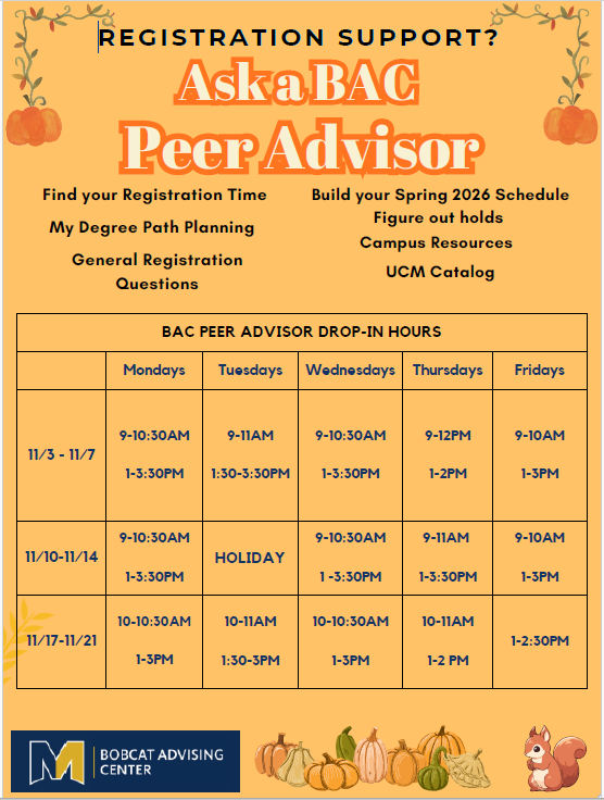 For the month of November 2025, our BAC peer advisors will not have any workshops available due to Spring 2026 course registration. Instead our peer advisors will be offering additional support for students who needs support with registration. You can find their availability and area of expertise down below.
